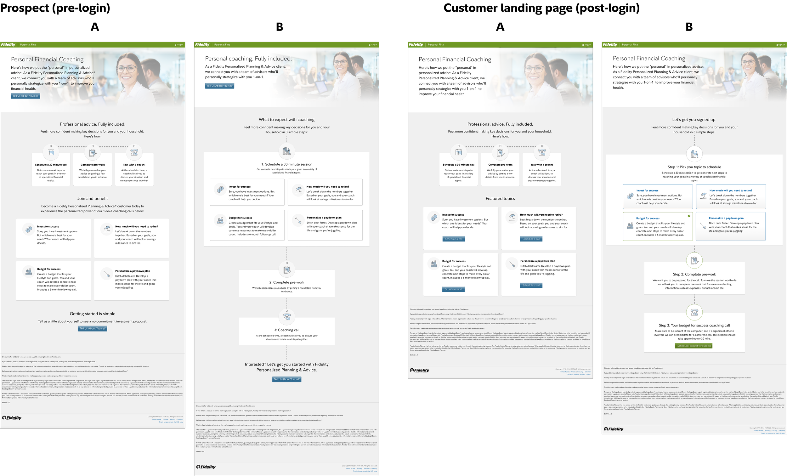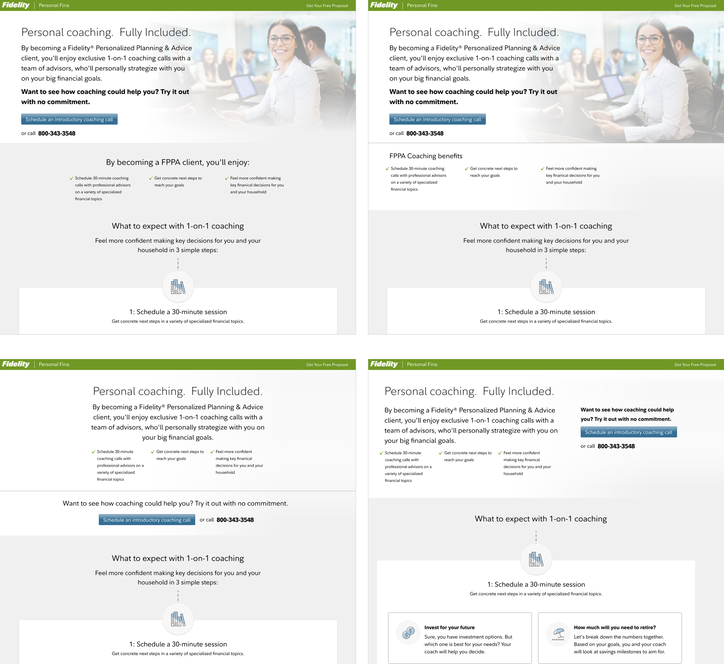 Drop-off on the landing page was high. The hypothesis was that the proposition was unclear — that the word "coaching" was doing too much work without enough support. Vanguard had launched "Personal advisor services" as a competing frame. Fidelity's page used "coaching," a term that meant different things to different people.
