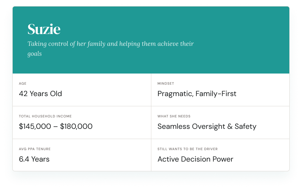 Suzie is an accomplished, self-reliant woman who manages her household finances with intention. She does her research. She doesn't like feeling naïve or unprepared, and she's skeptical of advice that doesn't feel relevant to her actual situation. She wants a financial relationship built around her, not a generic product pitch.