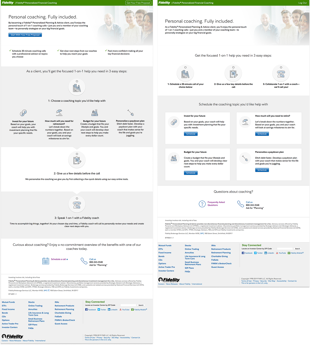 Prospects had no frame of reference for what a session involved. Logged-in customers, even those who had already shared their financial goals with the product, couldn't connect the coaching offer to their situation. The fix wasn't a copy tweak. It required dedicated space to explain the offering before asking anyone to schedule.