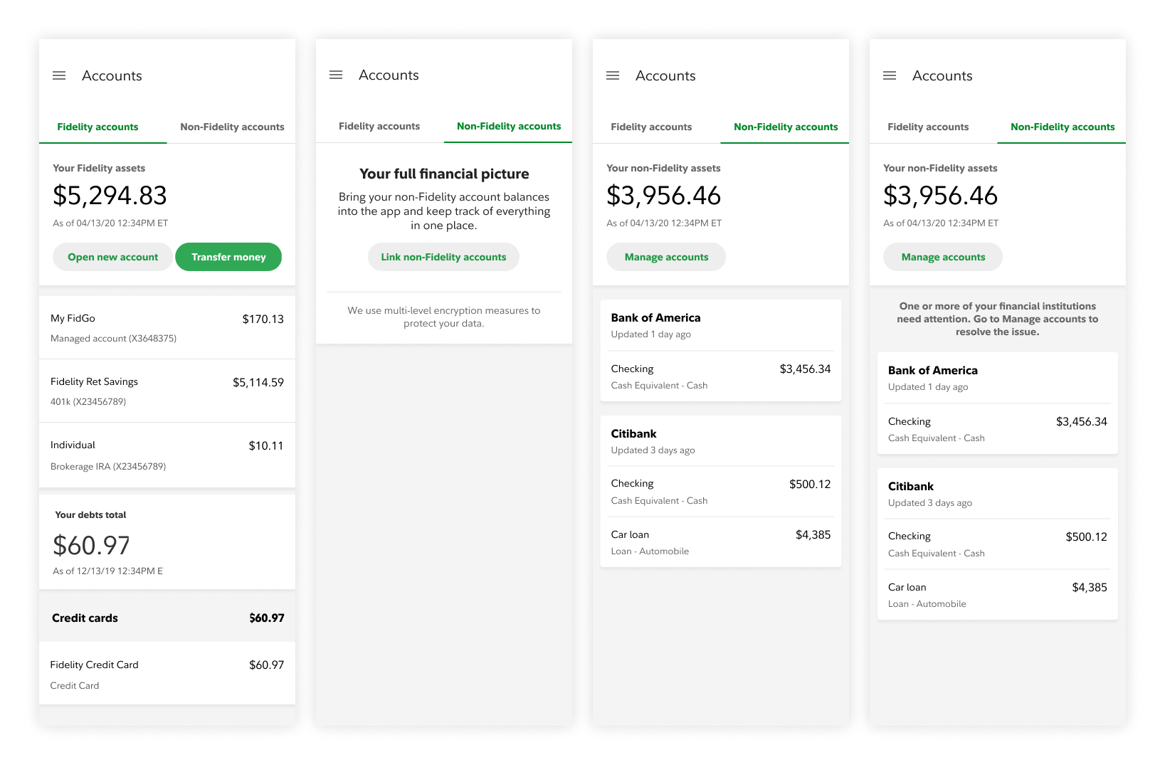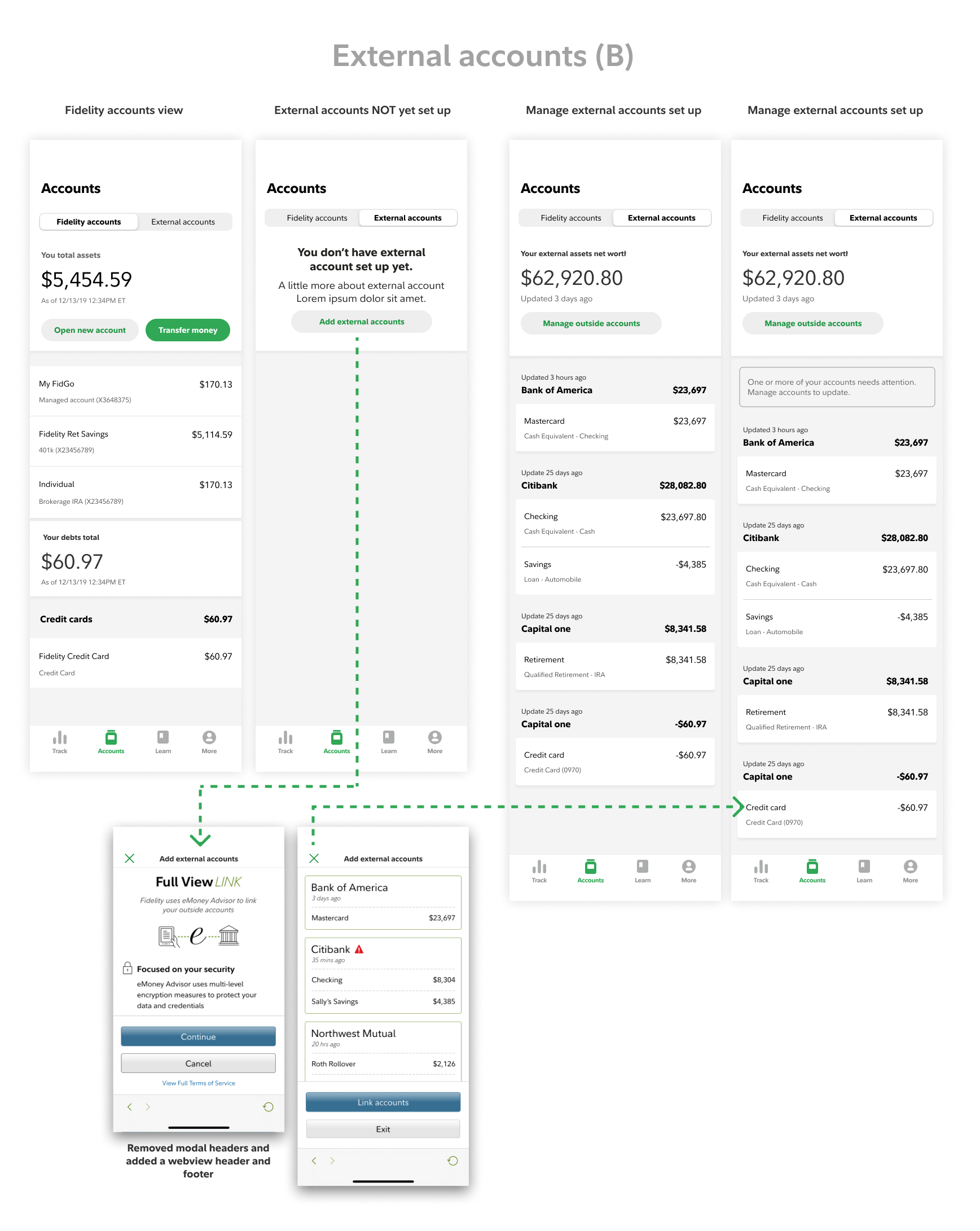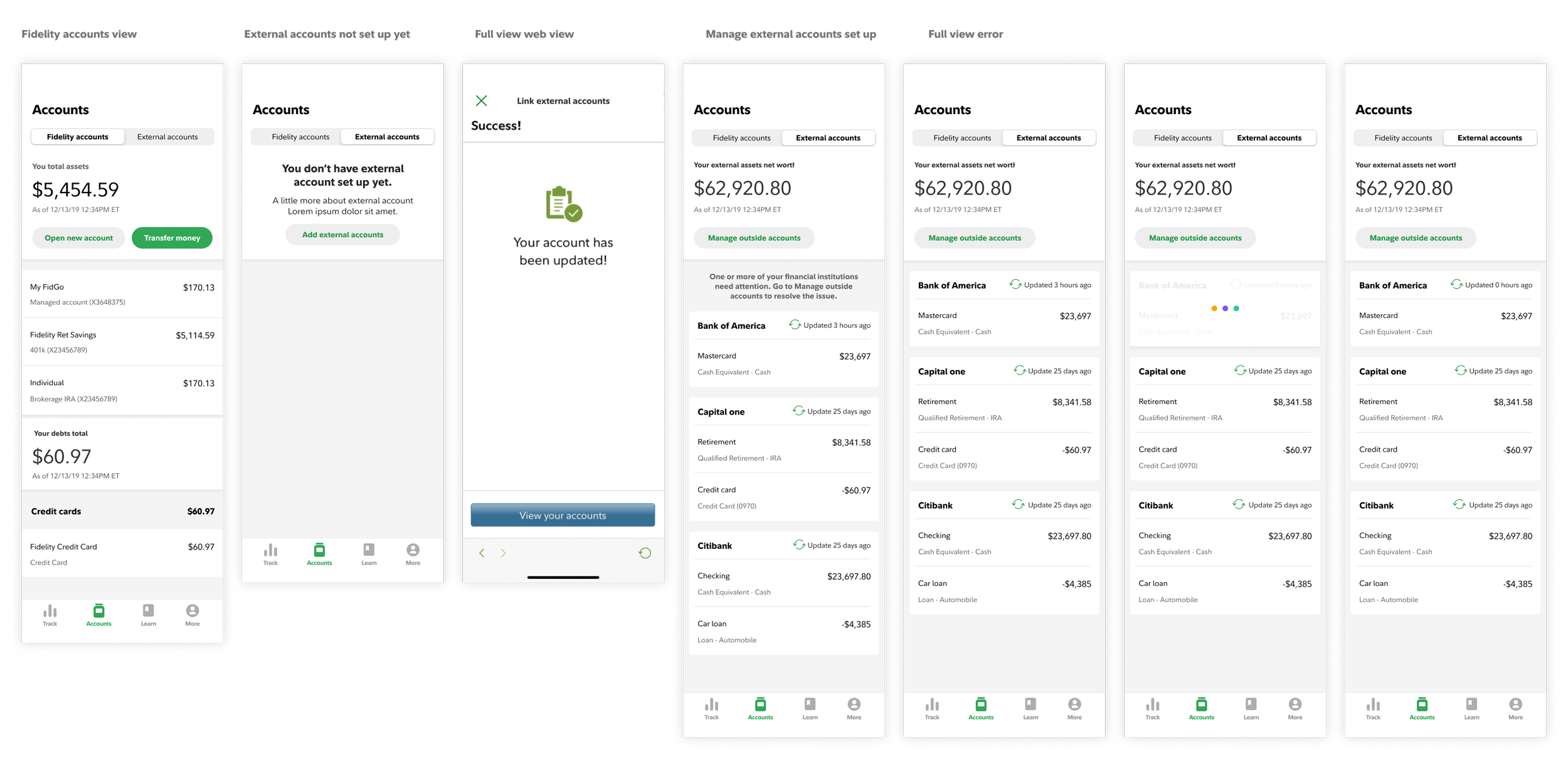 Users were telling us exactly what they needed: a way to see all their accounts in one place, not just their Fidelity ones. We brought external account linking into Spire by integrating an existing web-based aggregation tool called FullView, giving users a complete financial picture without leaving the app. The challenge was making that hybrid solution feel native and trustworthy.