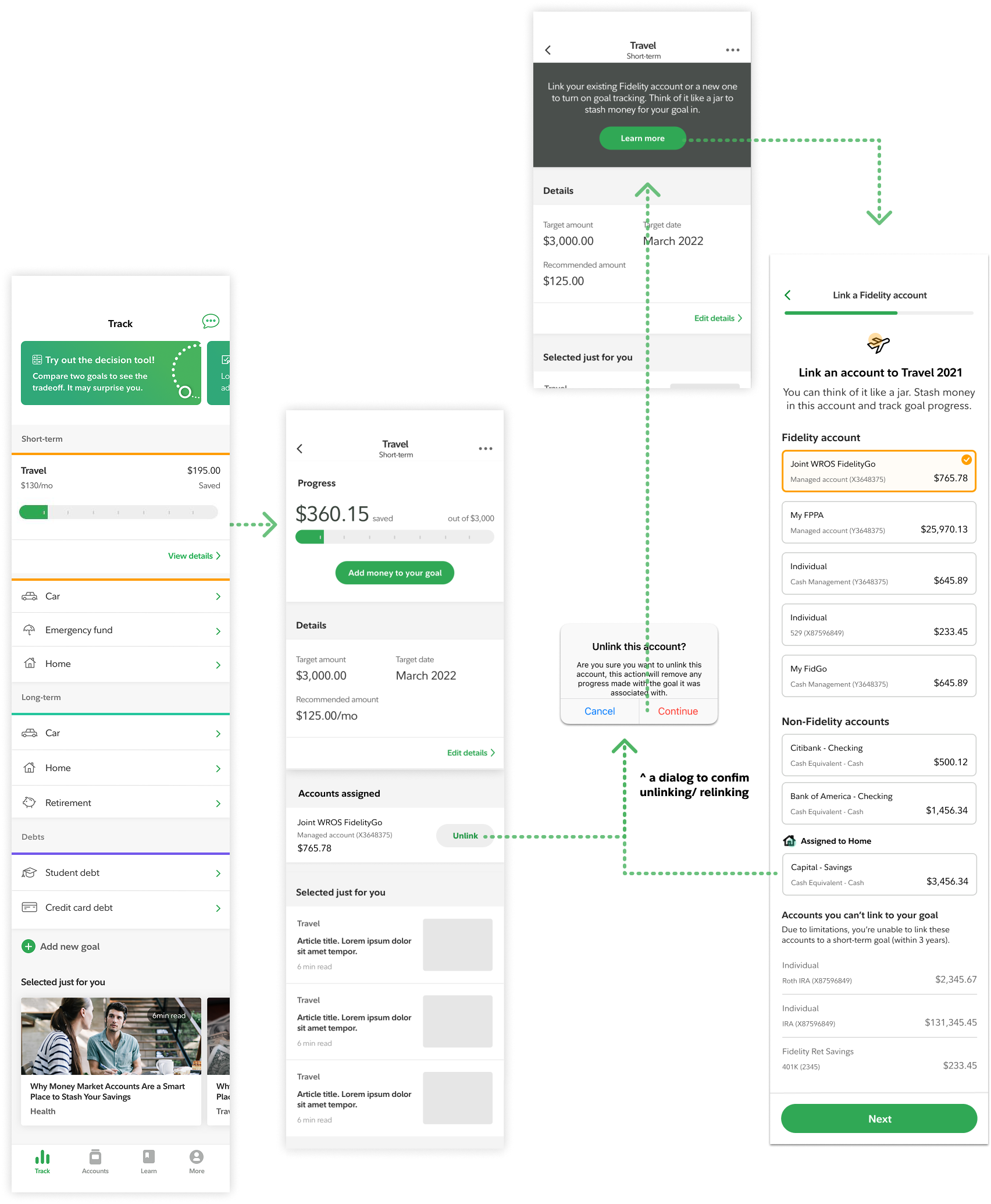 From the goal detail page, users could link or unlink an account to a goal directly, with a confirmation step before any change was made. Once linked, the account's balance and transactions appeared within the goal view.