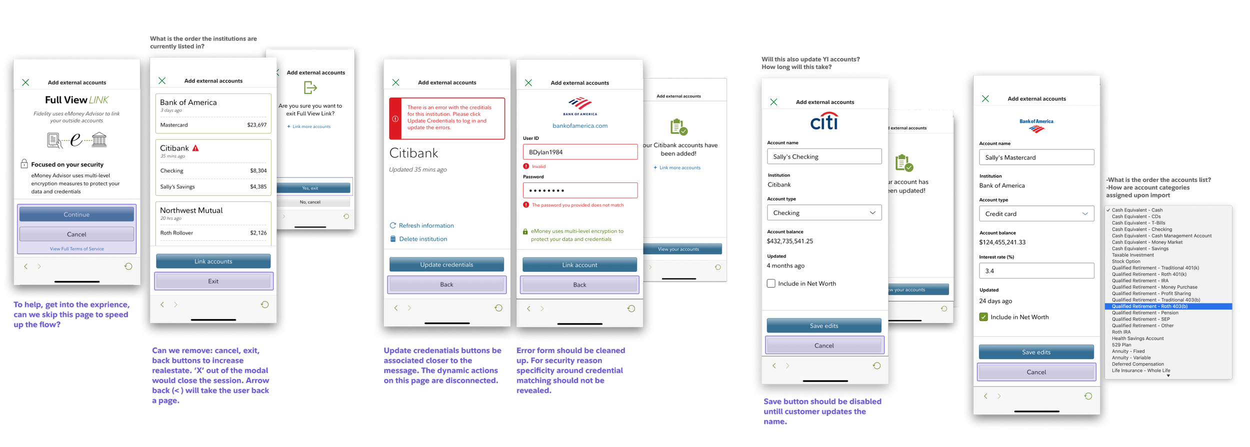 Fidelity already had a web-based account aggregation tool called FullView, built on eMoney Advisor. The goal was to pull that capability into Spire rather than build from scratch. That meant the design work was as much about integration and optimization as it was about net-new design.