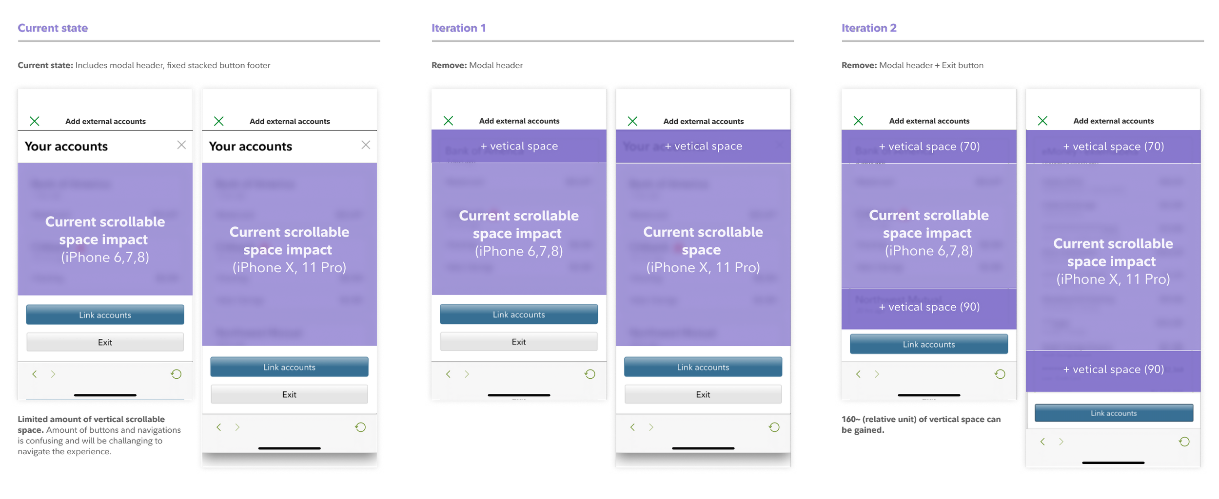 Removing the modal header in Iteration 1 and the exit button in Iteration 2 recovered approximately 70 units on iPhone 6/7/8 and 90 on iPhone X/11 Pro. It also simplified navigation and fewer redundant controls meant a clearer path through the flow.