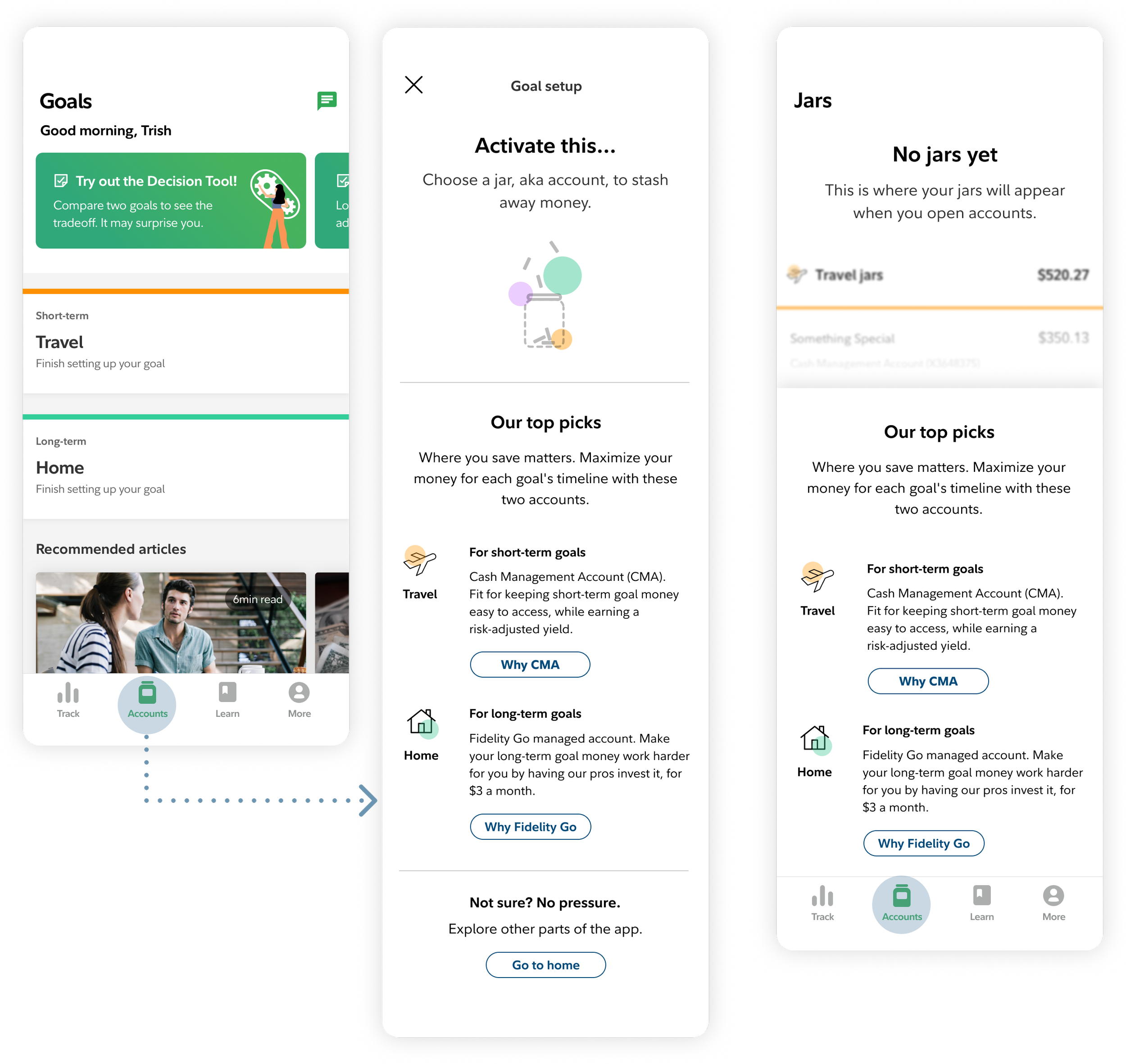 The left concept uses a modal to connect account recommendations to the user's goals; the right lands users directly on the tab and orients them from there.