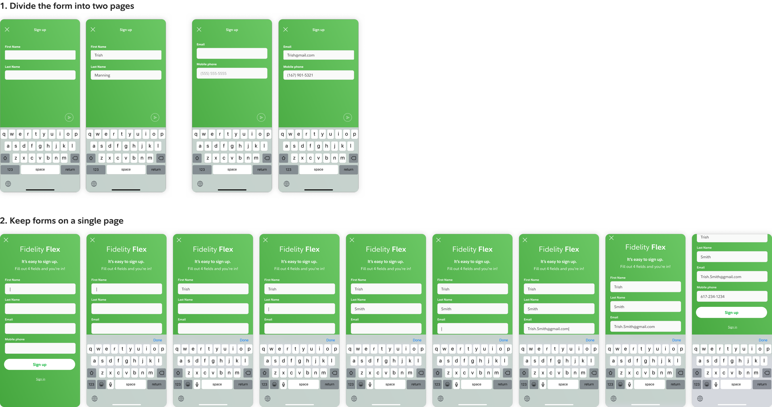 Two sign-up form approaches: paginated (top) versus single scrollable page (bottom). Field advancement and persistent keyboard on the single-page version reduced disorientation during mobile input.