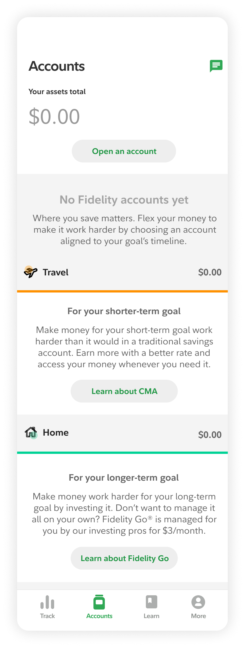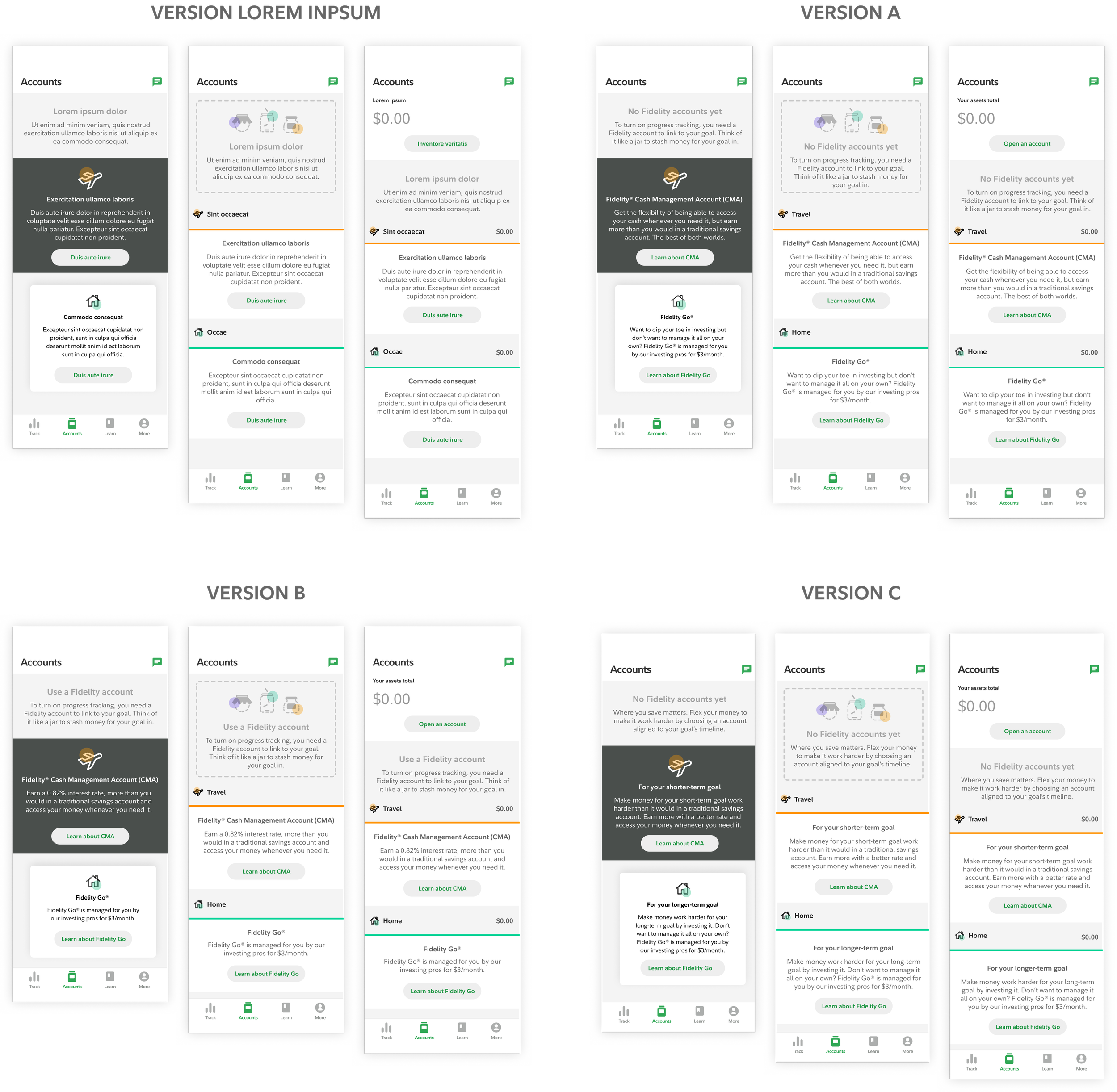 Concept C won consistently: balance at the top ($0.00), goal-labeled subtotals inline, clean hierarchy. Users came to the Accounts tab expecting to see a number. When it was there, everything read clearly. CMA labeled for short-term goals, Fidelity Go for long-term, the ambiguity the other concepts opened was resolved.