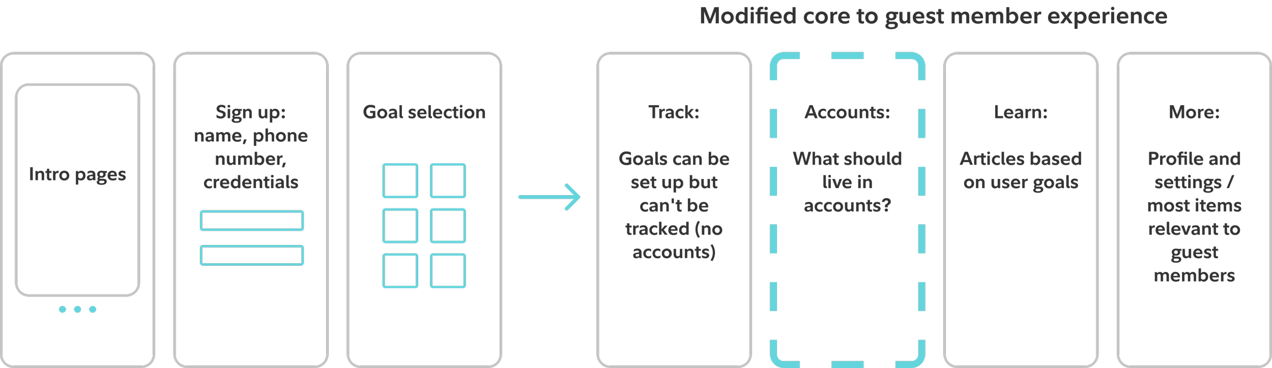 Once registered, a guest member landed in a version of the app where most of the experience carried over but not all of it worked the same way. Goals could be selected in onboarding, tracking required an account, learn was fully available. Track, Accounts, and More needed decisions. The diagram maps what was shareable, what needed reconfiguration, and what remained open with Accounts as the central unresolved question.