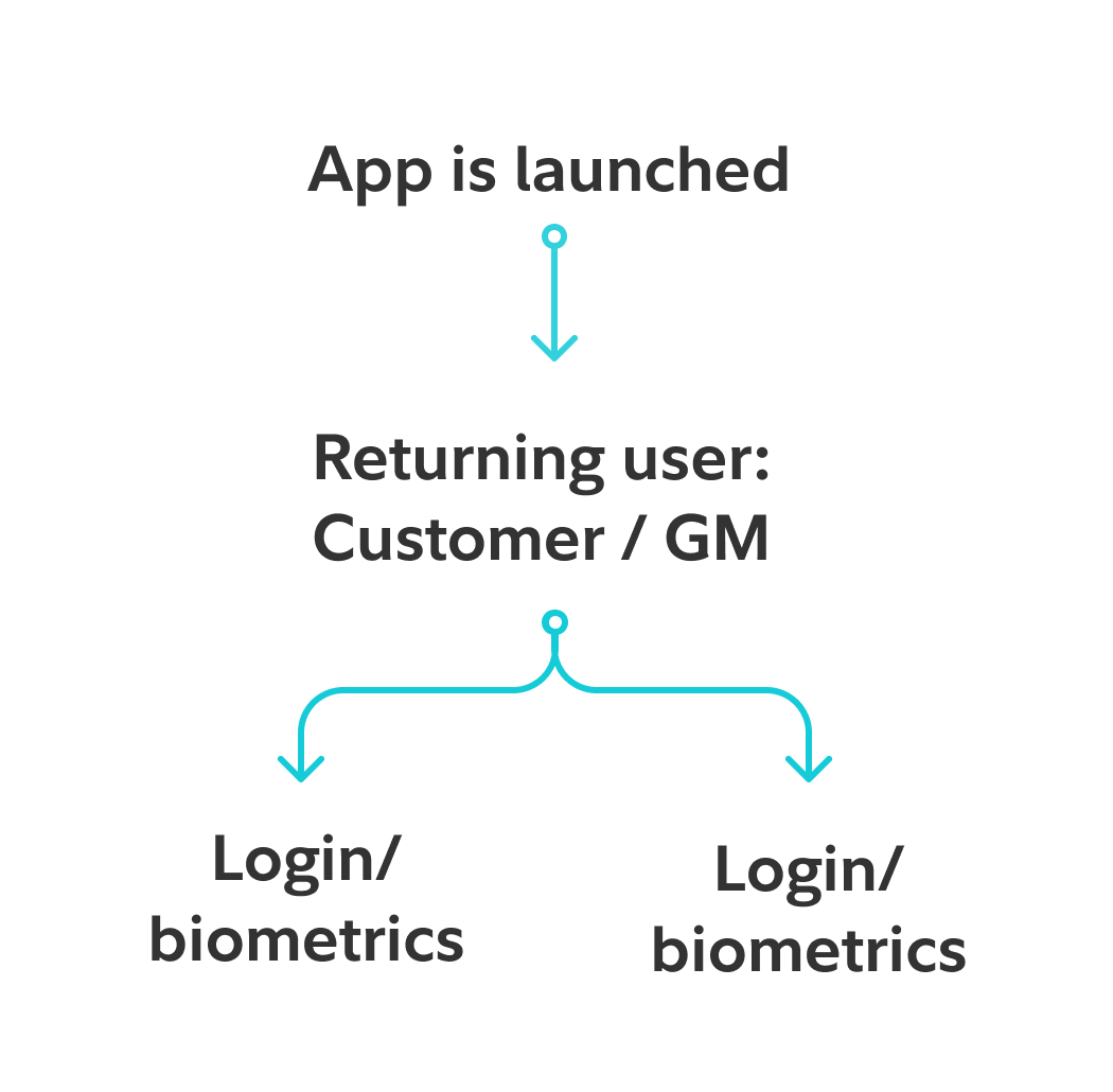 Returning user: Existing customers and guest members skip onboarding and authenticate directly via login or biometrics.