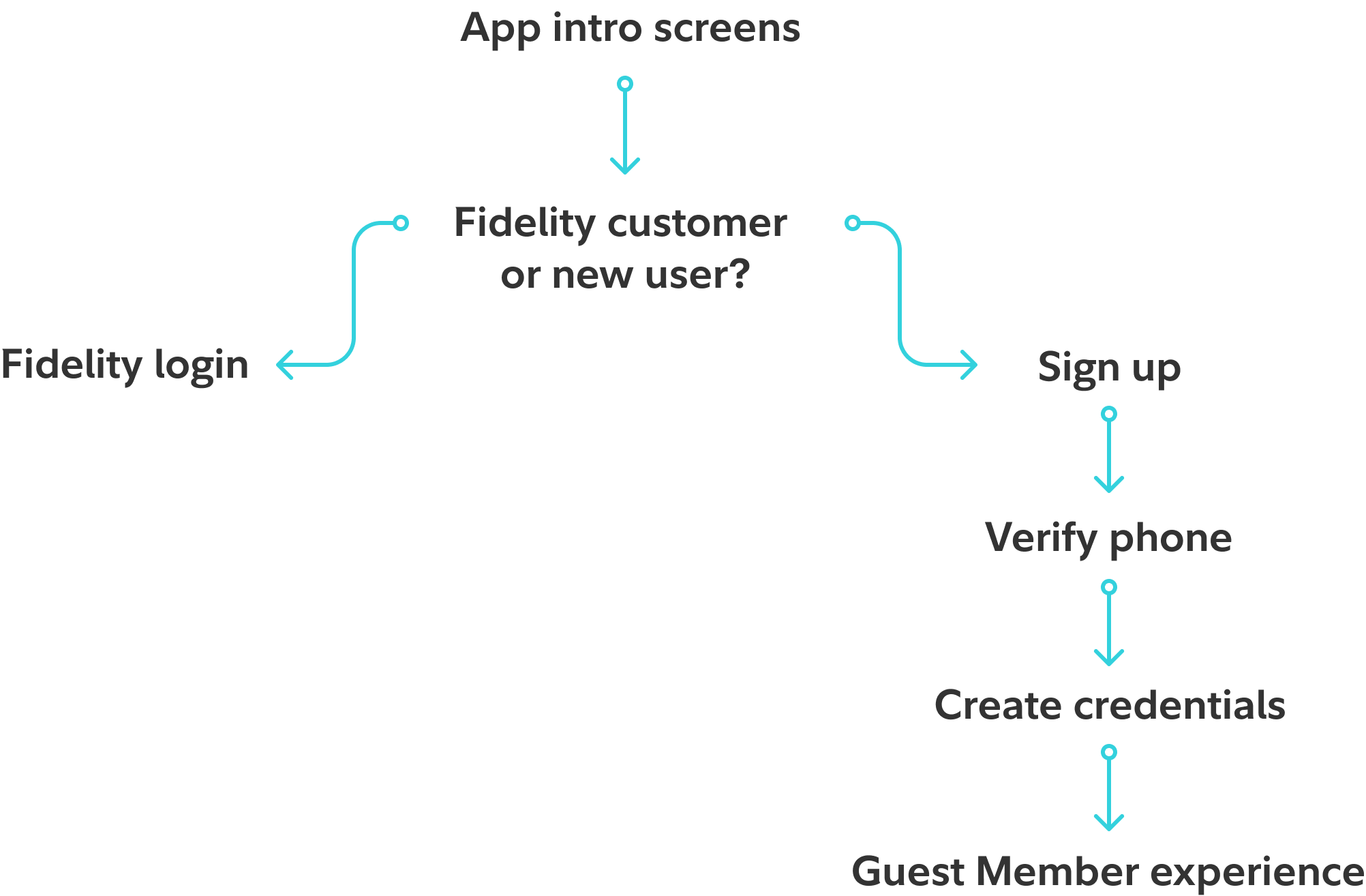 Four different use cases. How many entry points? Entry points for different users had to be established. Fresh install required orienting prospects with no Fidelity data, returning Guest member, customers and customers who forgot they have a Fidelity relationship.