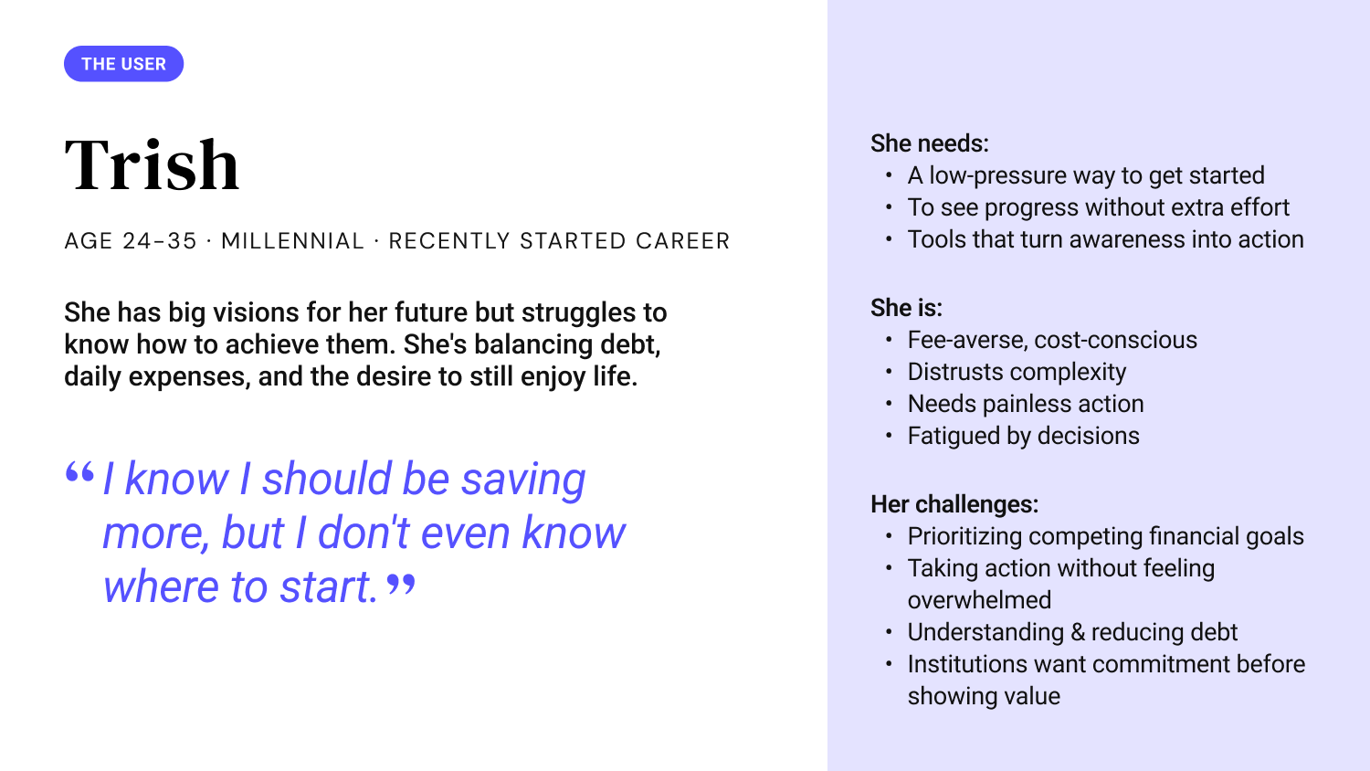 Every product decision on Spire ran through one question: does this work for Trish? Trish is a millennial in her mid-to-late twenties, recently into her career, balancing debt with the desire to start making progress. She has big financial goals but no clear path to achieve them. She knows she should be saving more. She just doesn't know where to start.